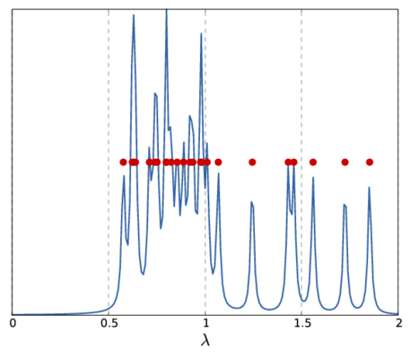 being the usual delta distribution, one obtains a graphical representation of the spectrum. An example for this is shown in the following picture for a small graph (left) and the convoluted spectrum of its Laplacian together with the eigenvalues.